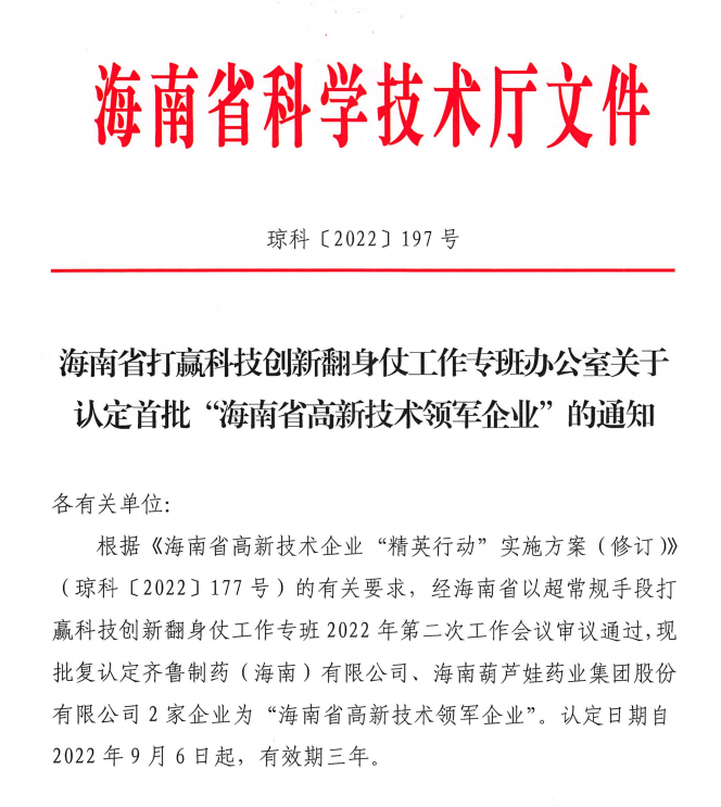 近日,海南省科学技术厅发布的《海南省打赢科技创新翻身仗工作专班办公室关于认定首批“海南省高新技术领军企业”的通知》中显示,批复认定海南必威betway药业集团股份有限公司等2家企业为“海南省高新技术领军企业”。认定日期自2022年9月6日起,有效期三年。